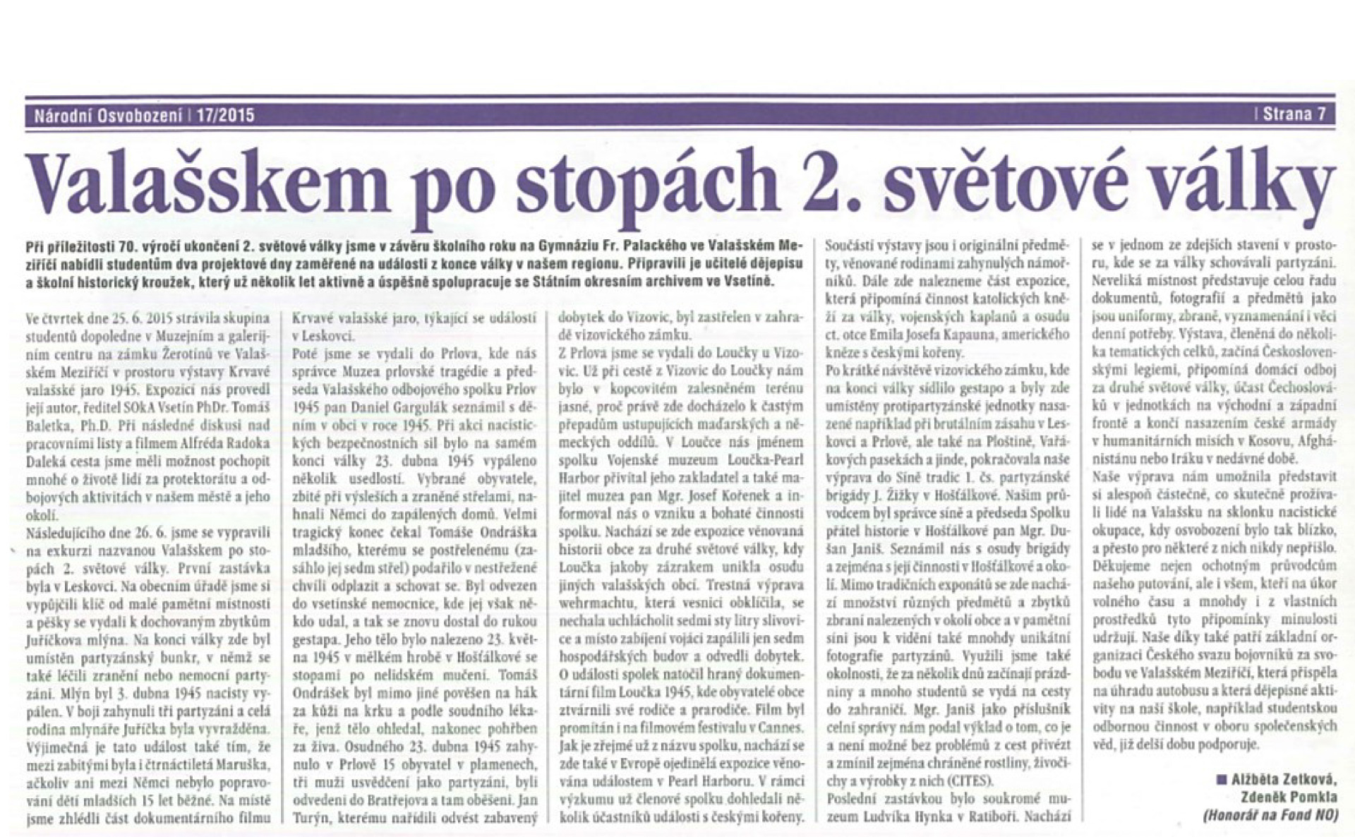 Členové spolku ve spolupráci s Gymnáziem Františka Palackého Valašské Meziříčí a Státním okresním archivem Vsetín připravili trasu vlastivědné exkurze pro studenty historického semináře a také je přivítali v expozici 1. čs. partyzánské brigády J. Žižky v Hošťálkové